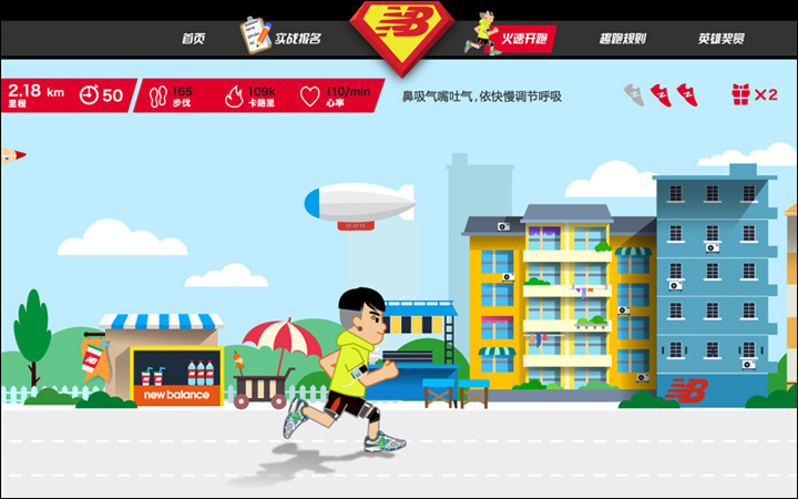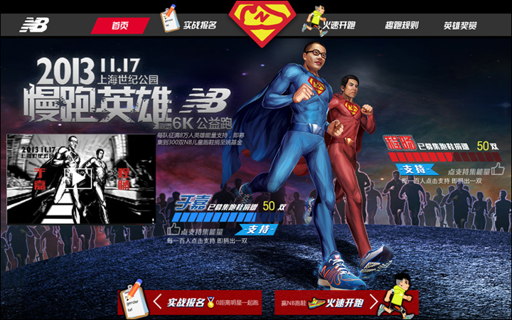 作為其互動營銷代理商的Leadinfo(立特整合營銷傳播機(jī)構(gòu))便以英雄扮演的趣味方式為New Balance創(chuàng)意了一款在線趣跑游戲http://newbalance.renren.com,用戶只需用人人網(wǎng)賬號登錄,即可選擇卡通角色邊跑邊體驗(yàn)身為英雄的快感。