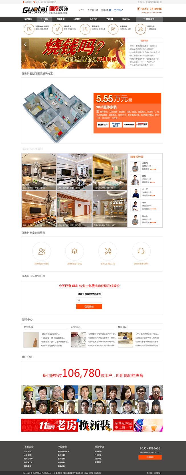 蚌埠市國泰裝飾工程有限公司成立以來,建立了從方案設(shè)計(jì)、工程施工、質(zhì)量監(jiān)督到售后服務(wù)等一整套合理的服務(wù)流程體系。并擁有具備豐富實(shí)踐經(jīng)驗(yàn)的專業(yè)高級設(shè)計(jì)團(tuán)隊(duì),更有一批資深的專業(yè)管理人員共同組成的誠信、敬業(yè)、務(wù)實(shí)、創(chuàng)新的精英管理團(tuán)隊(duì),為公司的持續(xù)發(fā)展和可靠的工程質(zhì)量提供了有力保障,共同構(gòu)筑了一套立體化交互式的集設(shè)計(jì)、施工、配套為一體的整體家裝解決模式。